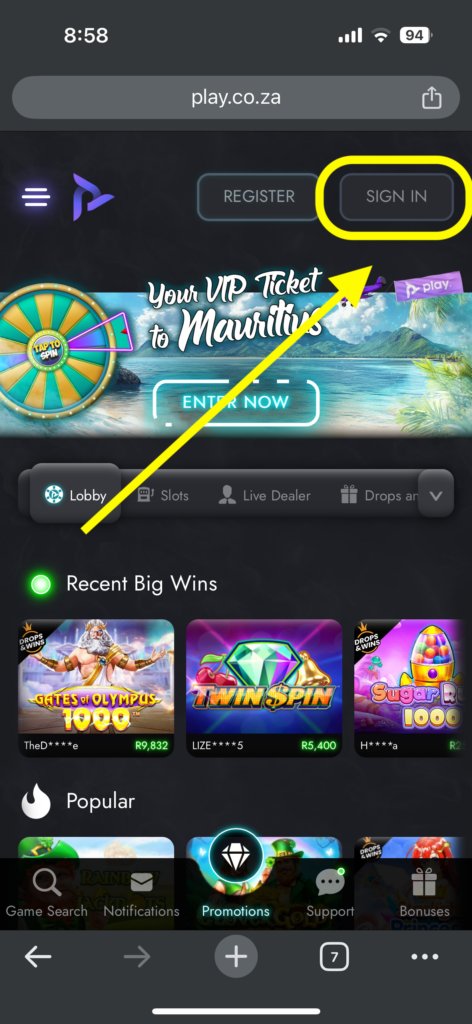 Step 2: Once you are on the Play.co.za homepage, you will see the “sign in” button located in the top right hand corner of the screen. Go ahead and click on this