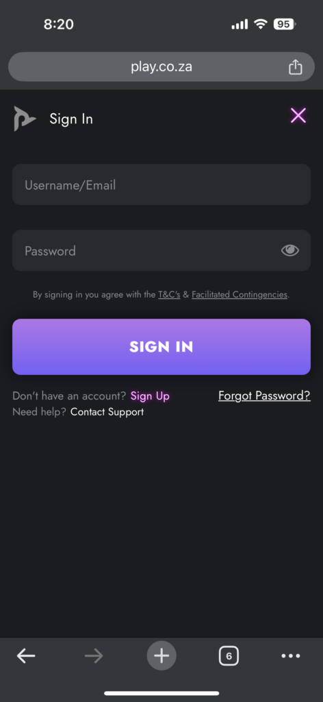 • Visit Play.co.za and log in using your registered email and password. If you don’t have an account yet, you’ll need to sign up first.
